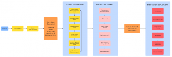 Create feature branches. Request features in plain English. Claude reads your docs, builds a feature plan, you approve, and Claude writes the code. Tests are handled by a Claude sub-agent. You stay in control.